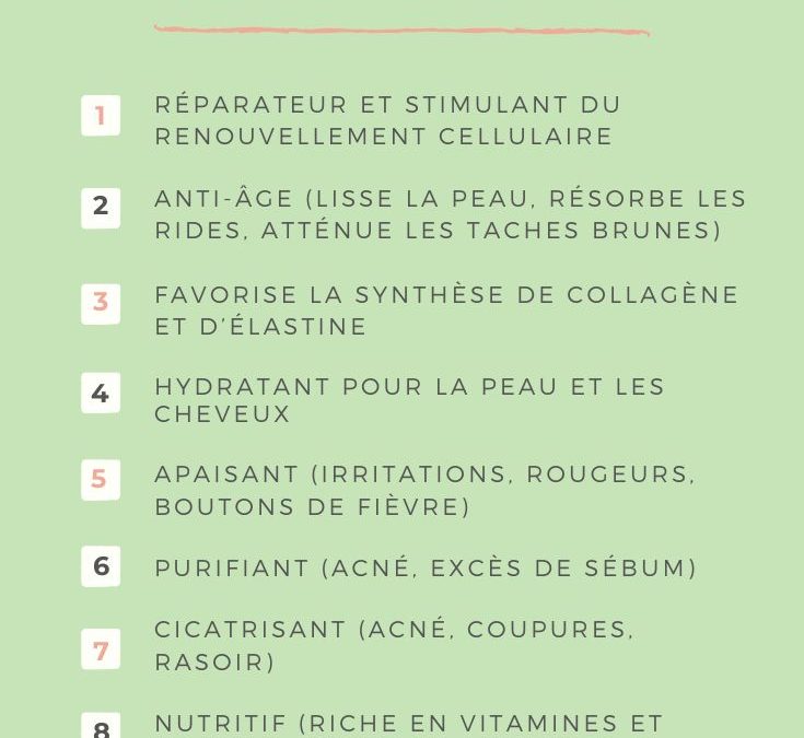 C'est une plante qui a de grandes propriétés médicinales. De plus, il possède de nombreuses vertus pour l'entretien de votre peau. Ces différentes vertus sont :